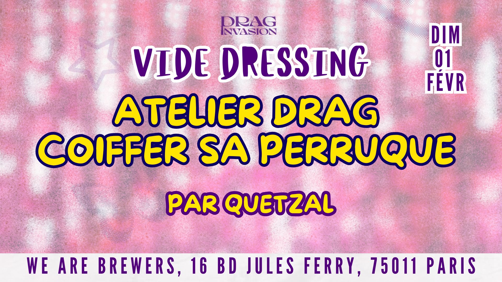 🪮 Atelier drag « Coiffer sa perruque » par Quetzal sous réservation ( Inscription sur Billetweb ) des 17h - 19h.